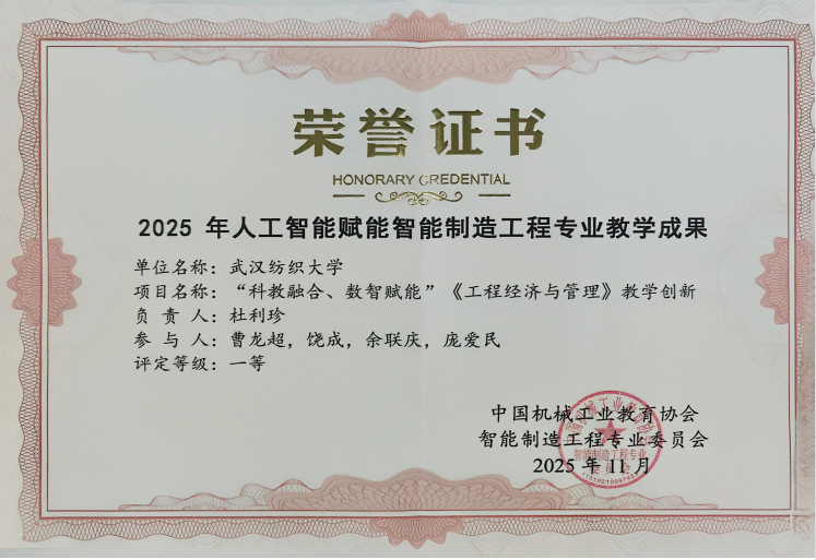 2025年11月21日至23日,中国机械工业教育协会智能制造工程专业委员会主办的智能制造人才培养主题研讨会在福建福耀科技大学圆满落幕。必赢bwin网址大全杜利珍老师受邀参会,其主持的教学成果《“科教融合、数智赋能”〈工程经济与管理〉教学创新》凭借鲜明的创新特色和扎实的实践成效,荣获人工智能赋能智能制造工程专业教学成果一等奖。