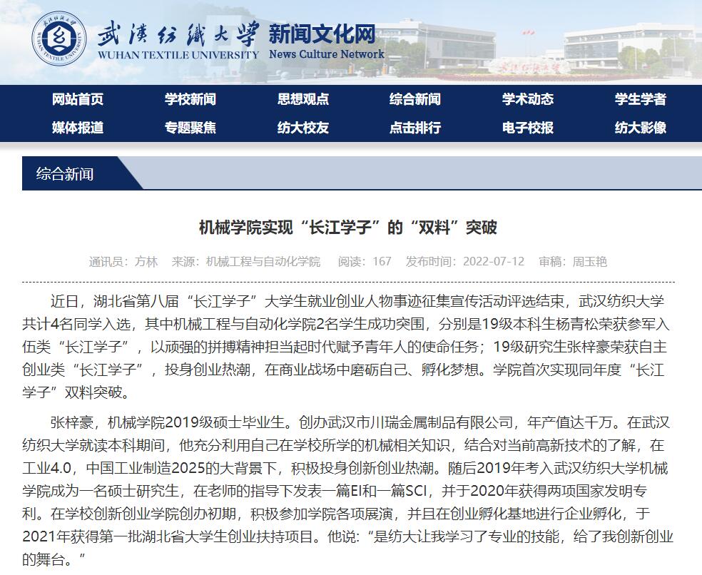 梅顺齐教授荣获2022中国纺联科学技术特别贡献奖—桑麻学者。学院加大人才引进力度,全年新报到博士8人,其中曹龙超博士获湖北省楚天学子荣誉称号。学院新增激光加工与检测技术和智能优化结构设计与可靠性研究两个学科团队。
