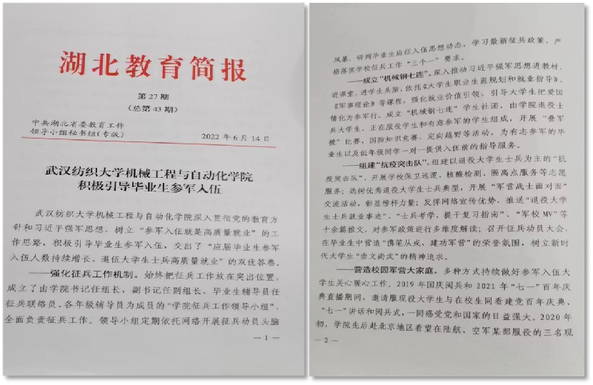 2022年,机械设计制造及其自动化专业工程教育认证自评报告获得专家一致好评,获得高票通过。在课程建设方面,继2021年《现代纺织工艺与设备》获批湖北省线下一流课程之后,2022年《电脑横机工艺与织造虚拟仿真实验》获批湖北省虚拟仿真一流课程,《数据技术与数控机床》获批湖北省线上线下混合式一流课程,至此学院线下一流课程、线上线下混合式课程和虚拟仿真一流课程三大类课程获得突破,为学生学习提供了优质的教学资源。