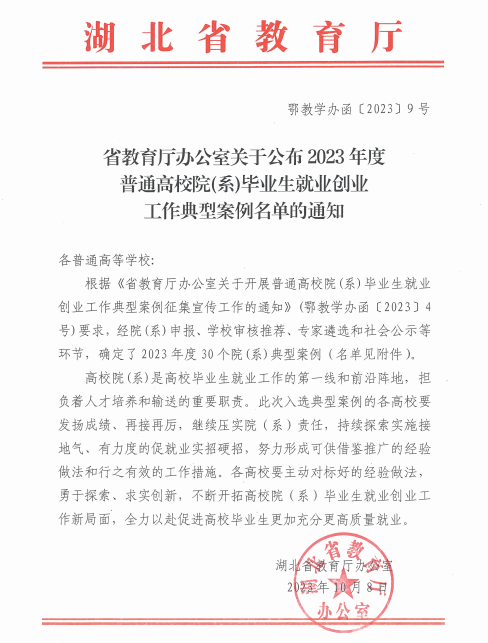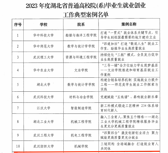 近日,湖北省教育厅公布了2023年普通高校院(系)毕业生就业创业工作典型案例遴选结果名单,此次遴选经过学院申报、学校审核推荐、专家遴选、社会公示等环节,评选出2023年度30个院(系)典型案例,必赢bwin网址大全案例《三链同构 全场域融合 打造就业育人共同体》成功入选,湖北高校中唯一连续两年获此殊荣。