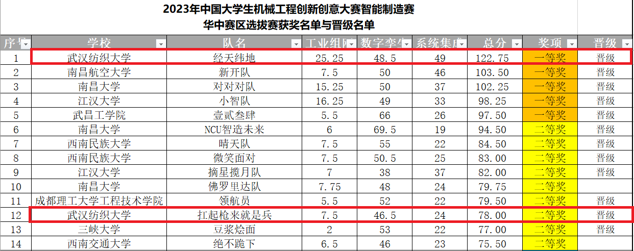 9月8日至9日,中国大学生机械工程创新创意大赛智能制造赛华中赛区比赛在江汉大学举行,来自四省15所高校的45支队伍同台竞技。我校必赢bwin网址大全积极组织4支学生队伍参赛,在张弛、杜利珍、樊飞、周国鹏、徐楚桥等老师的辛勤指导下,其中“经天纬地队”由本科生胡堃、袁广、熊迅组成,在华中赛区以第一名的成绩获得省赛一等奖晋级国赛,“扛起枪来就是兵队”由本科生王子辉、夏子豪、赵乐平组成,获得省赛二等奖成功晋级国赛。