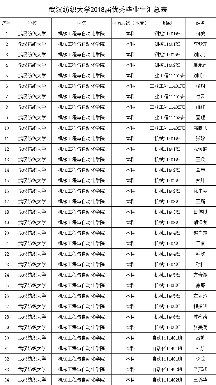 经过学生本人申请、班级集体评议、学院2018届优秀毕业生评选工作小组审核,报经学院党委同意,根据《必赢bwin官方网站本科优秀毕业生评选办法》(武纺大招毕【2018】3号)相关规定,拟授予以下34名同学优秀毕业生称号。具体名单如下: