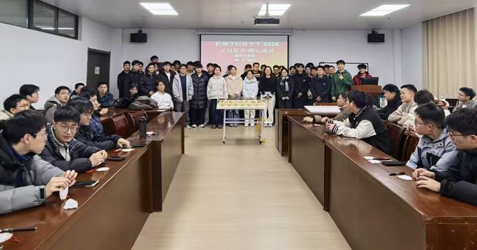 活动现场布置简洁大方,舞台背景以“2026”为主题,寓意新征程、新希望。晚会在热烈的掌声中拉开帷幕,同学们带来了歌曲、朗诵、互动游戏等节目,形式多样、气氛活跃,充分展现了机自学子的青春风采与团队活力。在集体生日环节,学院为当月过生日的研究生准备了生日蛋糕,全体人员共同唱响生日歌,现场洋溢着温暖与感动。辅导员付老师向同学们送上新年祝福,勉励大家在新的一年里坚定目标、勤奋学习、勇于创新。