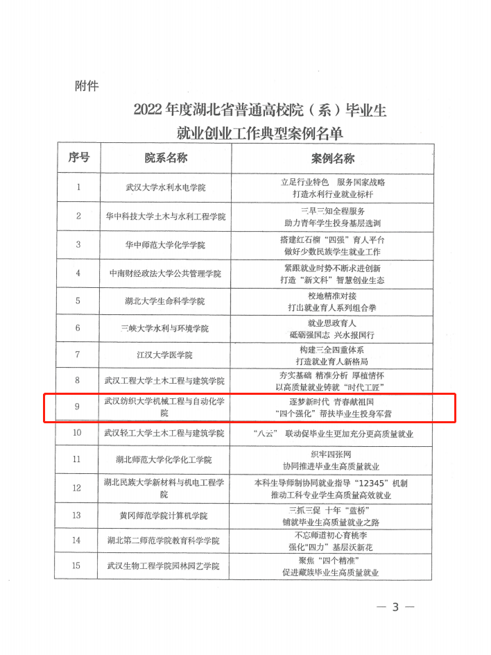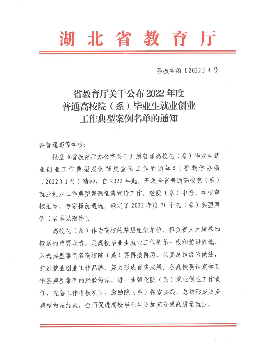 为总结推广工作中的典型经验做法,选树一批可学习、可借鉴、可推广的优秀案例和工作品牌,总结形成更多典型做法经验,促进全省高校毕业生更加充分更高质量就业,省教育厅启动了全省普通高校毕业生就业创业工作典型案例总结宣传工作,经各地各高校申报推荐,专家择优遴选,共确定30个典型案例。近日,湖北省教育厅公布了2022年度普通高校院(系)毕业生就业创业工作典型案例遴选结果,必赢bwin网址大全就业工作案例《逐梦新时代 青春献祖国——“四个强化”帮扶毕业生投身军营 》经过学校审核推荐、专家择优遴选,最终脱颖而出,成功获评湖北省普通高校院(系)毕业生就业创业工作首批典型案例。