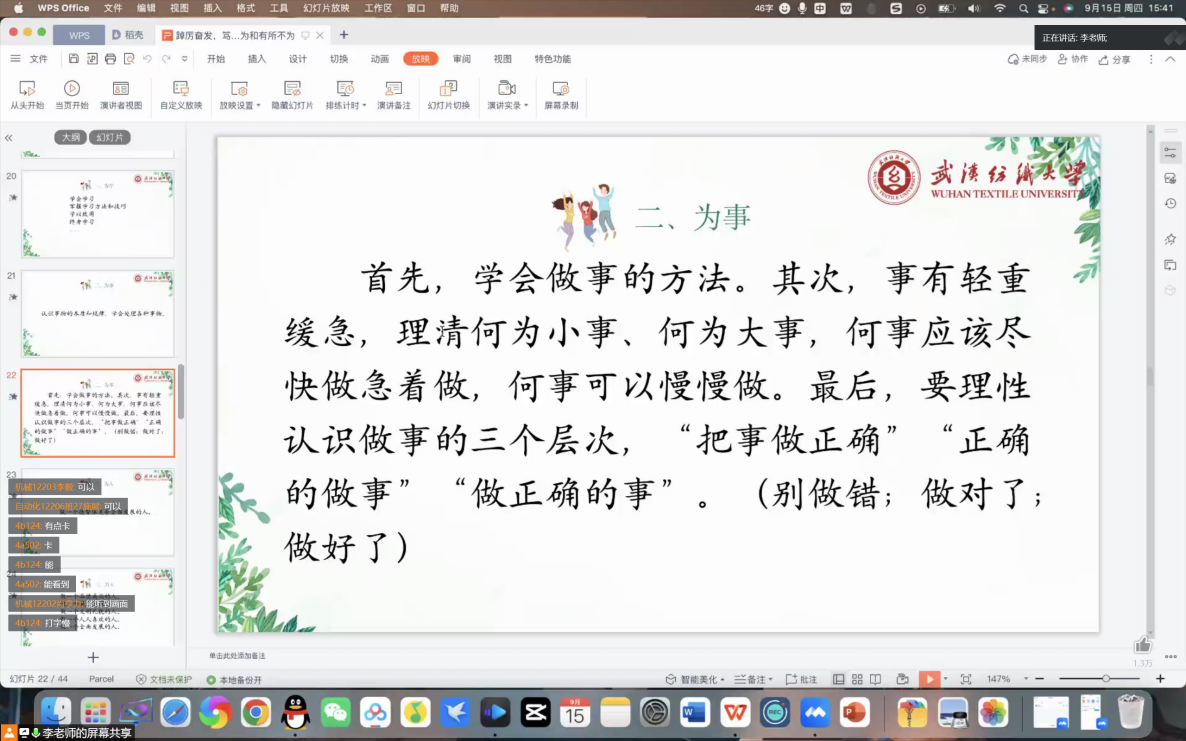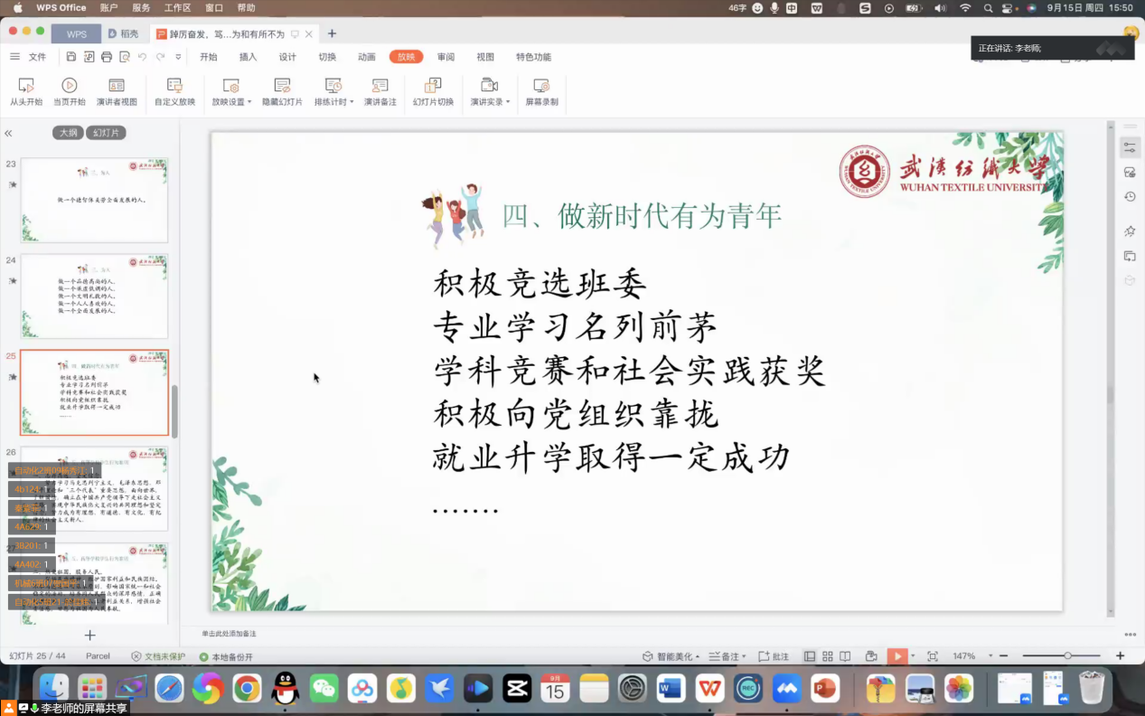 其次,李老师向我们展示了“何为有为,如何有为”,即“为学”,“为事”,“为人”。望新生成为一个德智体美劳全面发展的人。同时也劝诫新生不可做“不可为”之事。