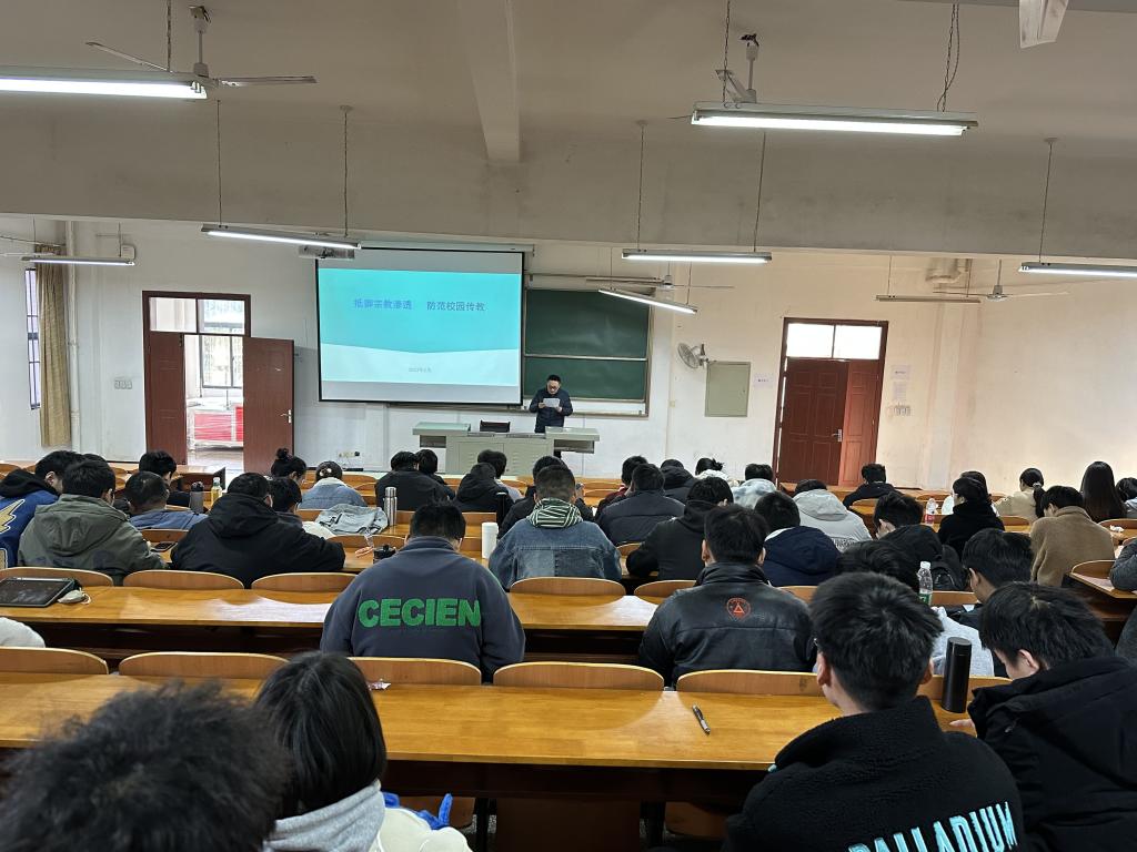 会上,谢老师宣传了习近平总书记关于宗教工作的重要论述和重要指示批示精神,党的宗教工作基本方针和宗教政策、全国和全省宗教会议精神及宗教相关法规和规章。谢老师强调了大学生宗教活动六不准,希望全体学生不断筑牢思想防线,自觉抵制非法宗教组织的渗透传播,树立科学的世界观、人生观和价值观。